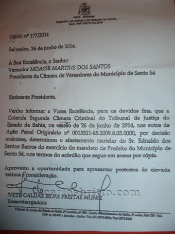 Coube à desembargadora Ivete Caldas Silva Freitas Muniz, através do ofício nº177/2014 (foto), comunicar a decisão do TJBA ao presidente da Câmara Municipal de Vereadores, Moacir Martins dos Santos.