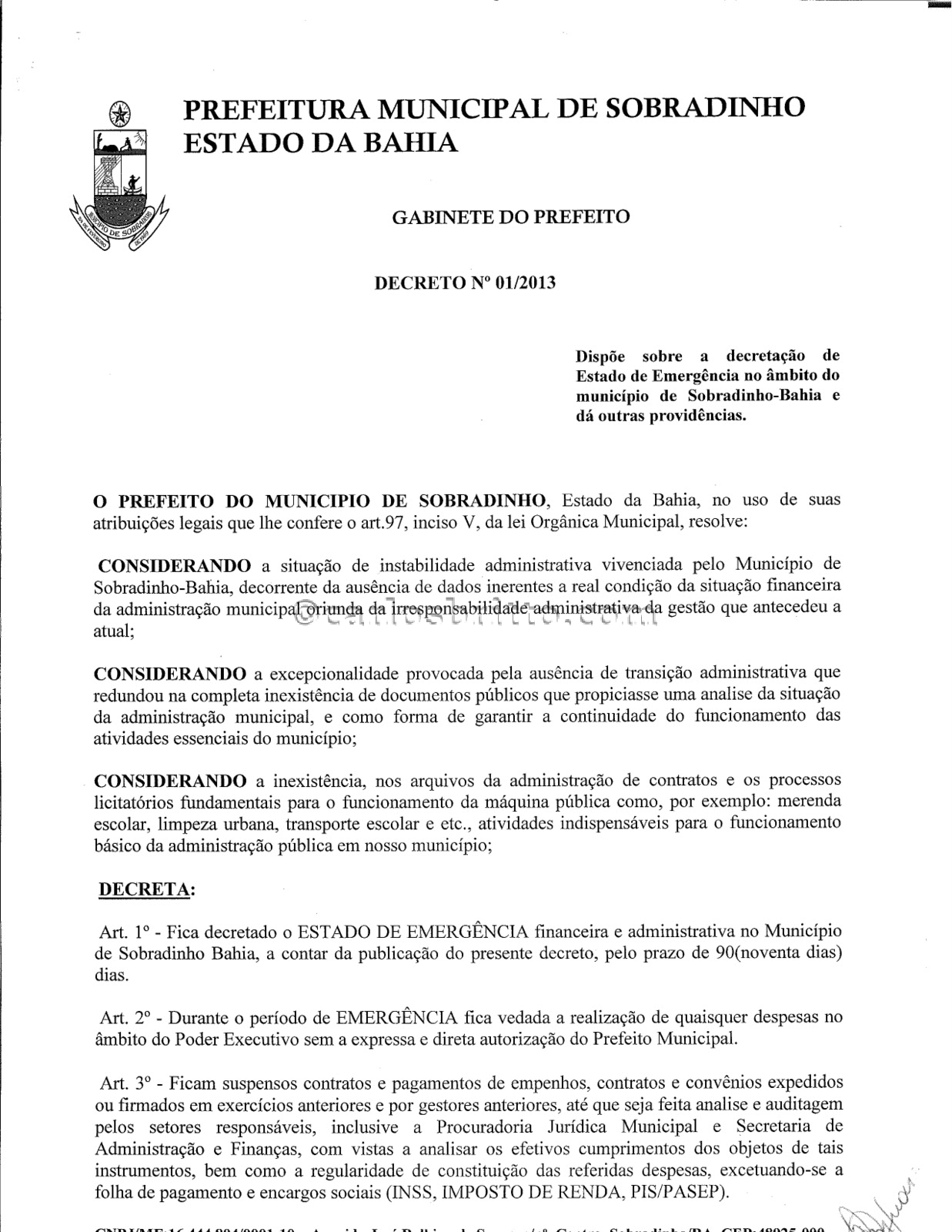 O prefeito de Sobradinho (BA), Luiz Vicente, mal assumiu o cargo no executivo e já decidiu tomar uma atitude extrema. Ele decretou estado de emergência financeira no município por 90 dias. Na justificativa para o ato, o novo gestor explica que o decreto é baseado no caos administrativo deixado pelo ex-prefeito Genilson Silva (PT).