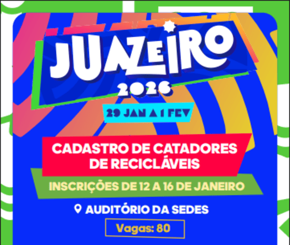 A Prefeitura de Juazeiro abriu o cadastro para catadores e catadoras de materiais recicláveis que irão atuar durante o Carnaval da cidade, que acontece entre os dias 29 de janeiro e 1º de fevereiro. A ação é coordenada pela Secretaria de Desenvolvimento Social, Diversidade, Igualdade Racial e Combate à Fome (Sedes).