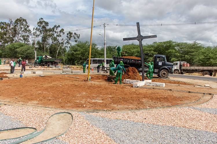 A rotatória vai receber um novo meio fio, paisagismo com seixos, britas e gramas, substituição da cruz, plantas e luzes ornamentais, além de novos postes com iluminação em LED. As obras estão a cargo da Secretaria de Obras e Desenvolvimento Urbano (Sedur).