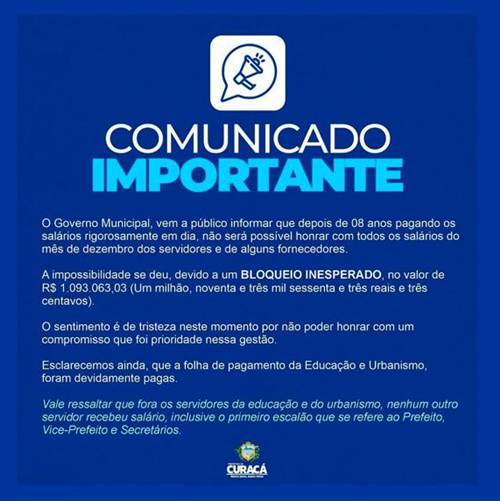 A Prefeitura de Curaçá (Norte da Bahia) admitiu dificuldades em pagar o salário deste mês da maioria dos servidores municipais e quitar compromissos com alguns fornecedores. A nota foi divulgada nesta terça-feira (31) pelas redes sociais.