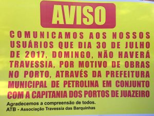 A partir desta terça-feira (25), um aviso sobre a interrupção temporária da travessia já se encontra presente nas embarcações. A decisão foi tomada durante reunião entre representantes da Prefeitura de Petrolina, Marinha do Brasil e Associação Travessia das Barquinhas (ATB).