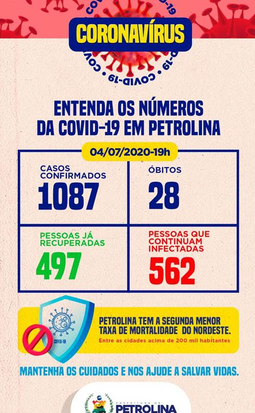 Apenas três casos do novo coronavírus (Covid-19) foram confirmados neste sábado (4) em Petrolina, segundo o boletim atualizado da Secretaria Municipal de Saúde (SMS). Todos foram diagnosticados por exames analisados laboratorialmente. São duas mulheres de 27 e 69 anos, e um homem de 26 anos. Com esses novos positivados, o município chegou ao total de 1.087 infectados – destes, 98 são detentos da Penitenciária Dr. Edvaldo Gomes.