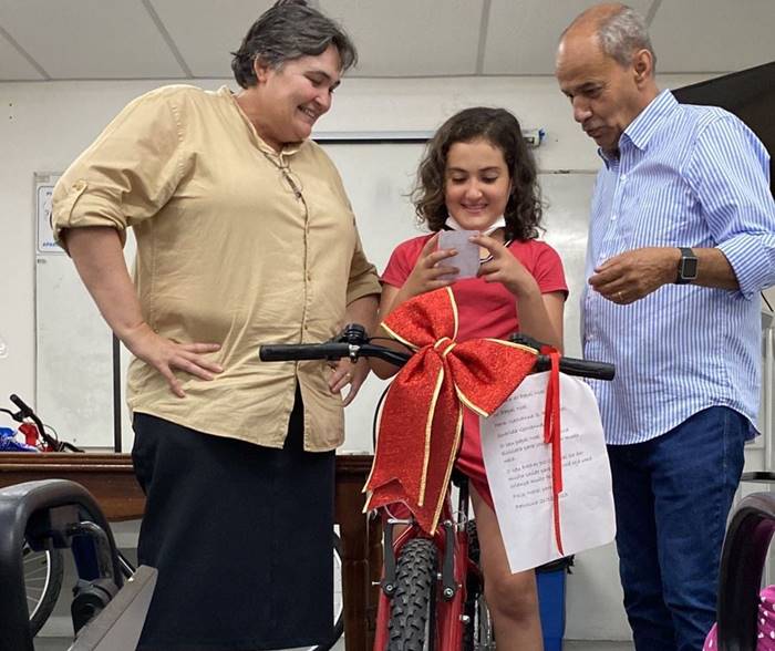 Na agenda a Petrolina, os representantes do FEHOSPE também fizeram a alegria da pequena Geovanna, de 7 anos. Ela recebeu das mãos de Irmã Fátima e de Gil a bicicleta dos seus sonhos. Geovanna é uma das 30 crianças que fazem tratamento contra o câncer no Hospital Dom Malan (HDM), a qual foi contemplada com o ‘Dia do Desejo’.