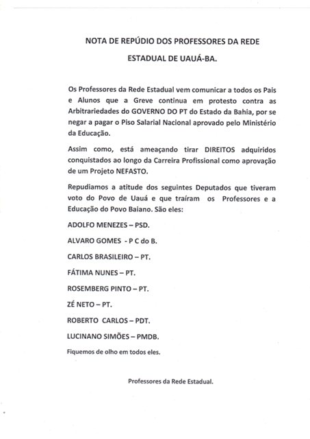 O protesto repudiou também a atitude dos deputados que, segundo a categoria, tiveram voto do povo de Uauá e traíram os professores. São eles: Adolfo Menezes (PSD); Álvaro Gomes (PC do B); Carlos Brasileiro (PT); Fátima Nunes (PT); Rosemberg Pinto (PT); Zé Neto (PT); Roberto Carlos (PDT) e Luciano Simões (PMDB).