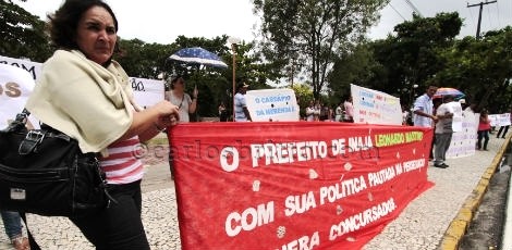 Munidos de faixas com ataques sérios à administração do prefeito, cerca de 100 pessoas, profissionais concursados da área de educação e exonerados, participam do protesto.