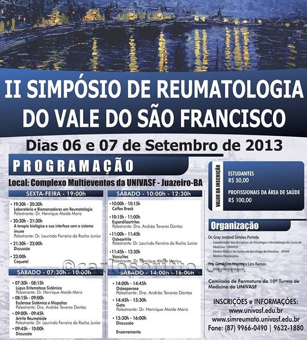 O universo da Reumatologia será abordado na próxima semana durante o 2º Simpósio de Reumatologia do Vale do São Francisco, organizado pela 10ª turma de Medicina da Univasf e pelos médicos Gray Portela e Geraldine Lins Ramos, com o apoio do Instituto de Oncologia (IOP) e o Instituto de Educação de Petrolina (IEP).