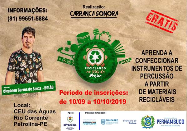 Crianças e jovens em vulnerabilidade social, pessoas de baixa renda, com algum tipo de deficiência ou mobilidade reduzida e idosos de Petrolina poderão aprender a confeccionar e tocar instrumentos percussivos gratuitamente. O curso, que será oferecido às segundas e terças-feiras, das 14h às 17h no Centro de Artes e Esportes Unificados (CEU) do Bairro Rio Corrente, é uma promoção do projeto ‘Reciclando no Viés da Música’ através da iniciativa cultural Carranca Sonora com apoio do Edital de Música da Fundarpe, Funcultura/Secretaria de Cultura e Governo de Pernambuco.