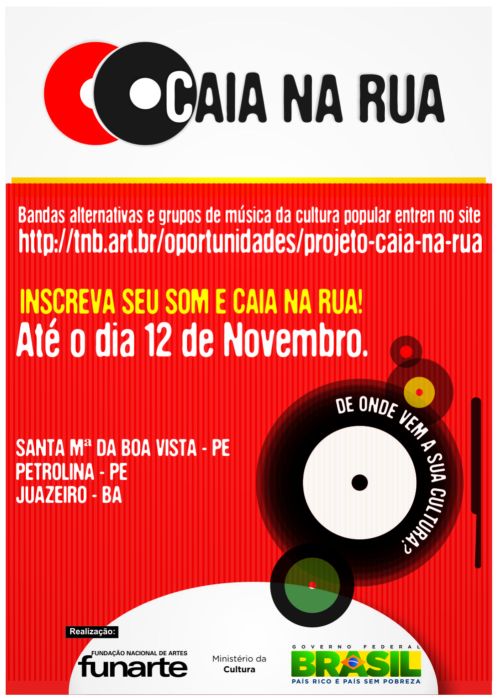 Bandas alternativas e grupos de música da cultura popular já podem se inscrever no projeto “Caia na Rua”. As inscrições vão até segunda-feira (12) pela internet. Proposto pelo músico e produtor cultural Maércio José e selecionado pelo Programa Mais Cultura, o projeto prevê a apresentação de shows, discotecagem e intervenções culturais nas praças públicas de Juazeiro, Petrolina e Santa Maria da Boa Vista (PE).