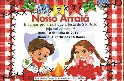 O Projeto Social/Escola Madre Teresa de Saldanha vai realizar no próximo dia 10 de junho (sábado), na Vila Débora, o 3° ‘Arraiá’ junino promovido pela instituição. O evento começará a partir das 16h, com uma programação que inclui apresentações de músicas e danças, venda de comidas típicas e bebidas (não alcoólicas), pescaria e brincadeiras. A ação tem como objetivo comemorar o São João promovendo a integração e confraternização de pais, alunos, funcionários e professores do PSMTS, assim como a comunidade em geral.