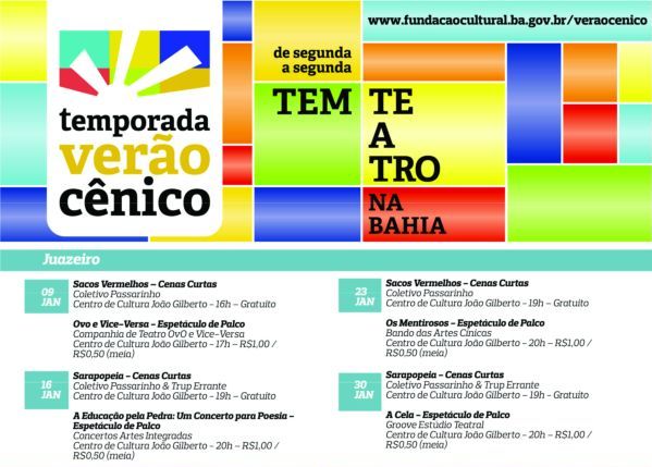 O mês de janeiro é de teatro na Bahia. Em sua 2ª edição, a Temporada “Verão Cênico” reúne 32 espetáculos em 96 apresentações em 14 cidades baianas, de todos os macroterritórios do estado. Em Juazeiro, os espetáculos acontecem às quartas-feiras, no Centro de Cultura João Gilberto e a entrada custa R$ 1 (inteira) e R$ 0,50 (meia). Em três categorias, “Temporada em Movimento”, “Mostra Cenas Curtas” e “Mostra Teatro de Rua”, a plateia vai poder experimentar uma mostra do teatro produzido no Estado.