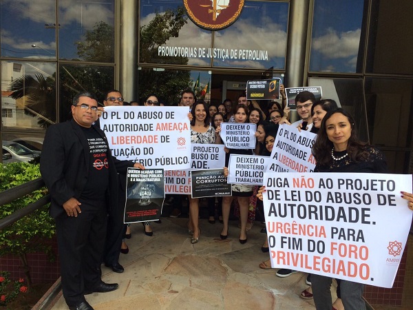 Promotores e funcionários do Ministério Público de Pernambuco (MPPE) em Petrolina, protestaram nesta quarta-feira, 26, contra o projeto de abuso de autoridade que tramita no Senado Federal. Com cartazes com dizeres como ‘Deixem o Ministério Público trabalhar ‘ e ‘Diga Não ao Projeto de Abuso de Autoridade”, os manifestantes mostraram que defendem a autonomia das promotorias e procuradorias.