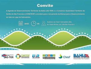 Posposta do Consórcio Sustentável Território do São Francisco (Constesf), o lançamento da ‘Aliança para o Desenvolvimento do Vale do Lago de Sobradinho’ acontecerá no próximo dia 30, às 9h, em solenidade no auditório da Companhia Hidrelétrica do São Francisco (Chesf), em Sobradinho, no norte da Bahia. A solenidade vai contar com a participação de autoridades locais e estaduais, como representantes das secretarias estaduais de Desenvolvimento Econômico (SDE) e da Ciência, Tecnologia e Inovação (Secti).
