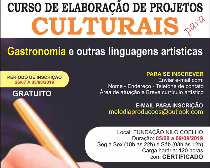 Prosseguem abertas em Petrolina, até o próximo dia 5 de agosto, as inscrições para o Curso de Elaboração de Projeto Culturais, que será ministrado pelo músico e produtor cultural Marcone Melo. Promovido pela Melodia Produções, o curso acontecerá entre os dias 5/08 a 9/09, das 18h às 22h, na Fundação Nilo Coelho, Centro da cidade. A iniciativa conta com o incentivo do Governo de Pernambuco, através da sua aprovação no edital do Funcultura 2017.