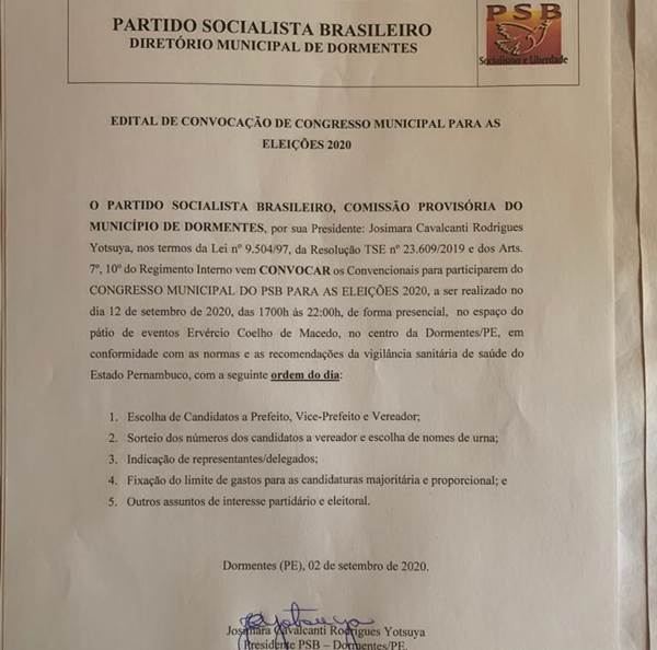 As movimentações políticas darão o tom neste sábado (12) em Dormentes (PE), Sertão do São Francisco, com a convenção municipal do Partido Socialista Brasileiro (PSB), marcada para este sábado (12), a partir das 17h, no Pátio de Eventos Ervécio Coelho de Macedo. Da legenda faz parte atualmente a prefeita Josimara Cavalcanti, que tentará renovar o mandato nas eleições deste ano.