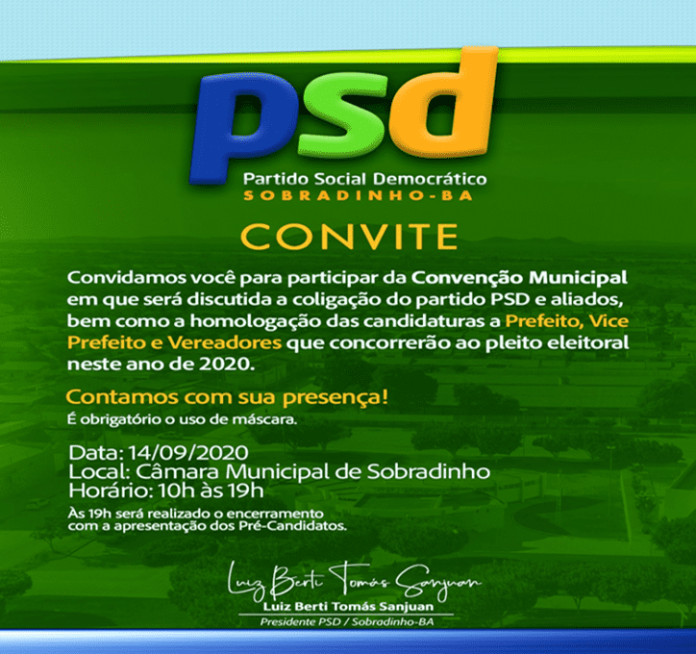 O Partido Social Democrático (PSD) de Sobradinho, norte da Bahia, realizará nesta segunda-feira (14), sua convenção municipal, das 10h às 19h, na Câmara de Vereadores, para formalizar seus candidatos às eleições 2020. Respeitando todas as determinações sanitárias, a organização do evento informa que uso de máscara e o distanciamento social é obrigatório no local.
