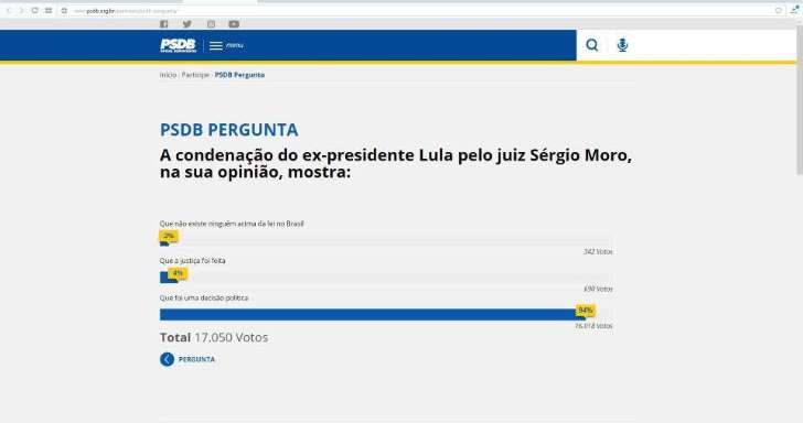 O PSDB só queria ouvir a opinião do povo. Mas as coisas não saíram como o partido planejou. Uma enquete no site do PSDB perguntava nessa semana sobre a condenação do ex-presidente Lula pelo juiz Sérgio Moro.
