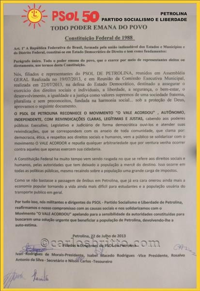 É o caso do PSOL, que enviou à imprensa local uma nota pública de apoio à causa do movimento. Confiram abaixo: