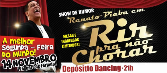 Depois do sucesso que foi a temporada de estreia do espetáculo “Rir para não chorar”, o humorista Renato Piaba vem a Juazeiro no dia 14 de novembro para mostrar todo o seu humor. O show está marcado para o Depósitto Dancing, no Armazém Caffé, em Juazeiro, às 21h.
