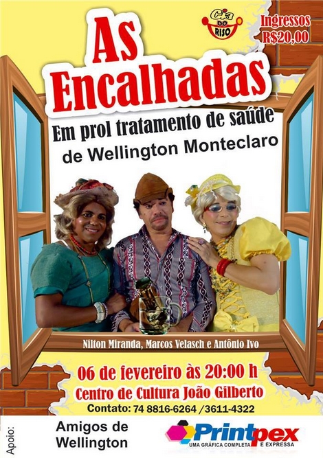 Os atores Nilton Miranda, Marcos Velasch e Antonio Ivo apresentarão nesta sexta-feira (6), no Centro de Cultura João Gilberto, em Juazeiro, às 20h, o espetáculo teatral “As Encalhadas”. Dessa vez, a renda adquirida com a peça será revertida para o tratamento de saúde do também ator e professor Wellington Monteclaro, que recentemente passou por uma cirurgia renal.