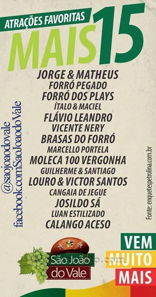 Repetindo o número 15 e as cores de campanha, o pôster publicado na rede social mostra – em letras garrafais – que são mais 15 atrações favoritas, deixando a entender que os artistas também foram votados através da enquete elaborada pela prefeitura.