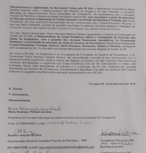 O documento foi referendado por todos os participantes da reunião e foi enviado, além de Paulo Câmara, à secretaria estadual de Infraestrutura, Fernandha Batista.