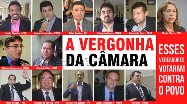 O cartaz que fala da “Vergonha da Câmara” e classifica os vereadores que “votaram contra o povo” está sendo compartilhado com força no Facebook. Causa e Consequência.