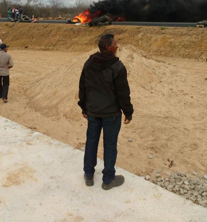 Uma manifestação no Distrito de Conceição das Crioulas, zona rural de Salgueiro (PE), Sertão Central, protesta contra a paralisação da obra de pavimentação da rodovia que liga a BR-116 a Conceição das Crioulas.
