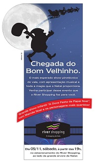 O clima natalino chegou definitivamente ao River Shopping. Neste sábado (05) a direção do centro de compras prepara-se para inaugurar a decoração de Natal, que vai culminar com a chegada do Papai Noel. O ‘bom velhinho’ será recepcionado à altura, com um show musical intitulado “A doce festa do Papai Noel” que acontecerá, às 19h, no estacionamento do shopping, na entrada próxima as lojas C&A e Marisa.