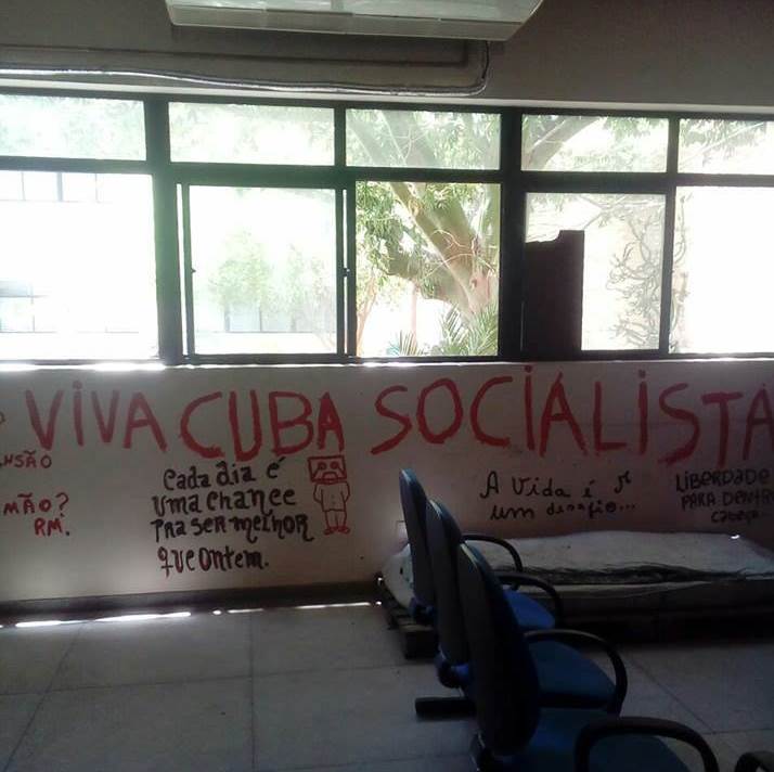 Frases com dizeres do tipo “Viva Cuba Socialista!”, “Comunismo Vencerá”, “Eleição é Farsa” e “Todo Poder ao Congresso do Povo!” foram espalhadas em algumas salas de aula da instituição.