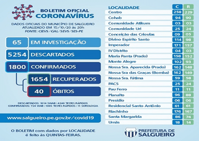 O boletim também registrou o aumento de 202 pacientes recuperados, totalizando 1.654 curas clínicas. Atualmente 106 casos estão ativos em Salgueiro. Já os óbitos permanecem em 40.