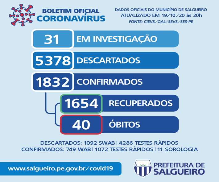Com essa atualização, Salgueiro contabiliza 1.832 casos da covid-19, além de 1.654 recuperados, e mantém os 40 óbitos registrados no último informe. Até o momento foram descartados 5.378 casos e 31 estão sendo investigados pelas equipes de saúde do município.