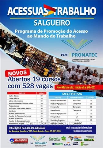 1964769_522144727906767_1121437648_nComeçaram desde ontem (26) em Salgueiro (PE), no Sertão do São Francisco, as pré-matrículas de 19 cursos do Programa Nacional de Acesso ao Ensino Técnico e Emprego (Pronatec) que vão beneficiar interessados na zona urbana e rural.