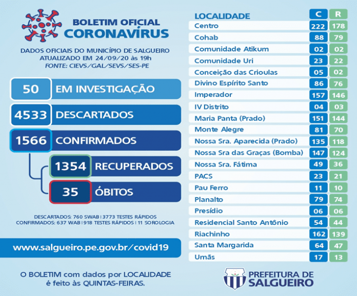Mais 132 casos de curas clínicas foram registrados. Já são 1.354 pacientes recuperados da Covid-19. Atualmente 177 casos estão ativos em Salgueiro. Os óbitos permanecem em 35.