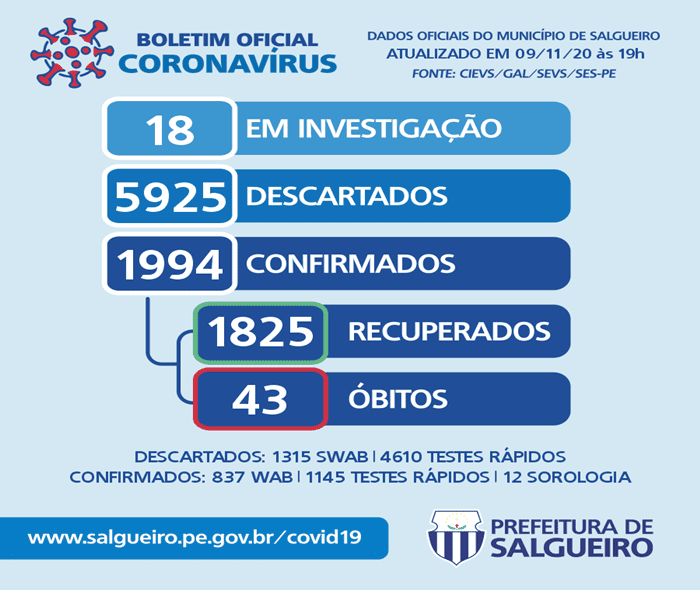 Com essa atualização, Salgueiro contabiliza 1.994 infectados pela doença, além de 1.825 recuperados e 43 óbitos.