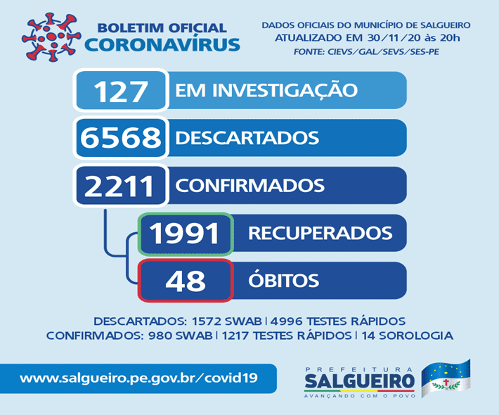Com essa atualização, Salgueiro contabiliza 2.211 casos positivos da doença, além de 1.991 recuperados e 48 óbitos. Até o momento, existem 172 casos ativos no município.