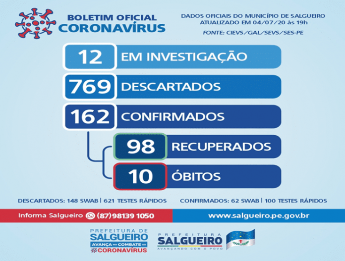 Com essa atualização nos dados, Salgueiro totaliza 162 casos confirmados, 98 recuperados e 10 óbitos pela Covid-19. Ainda existem 12 pessoas em investigação e 769 casos foram descartados por testarem negativo para o vírus.