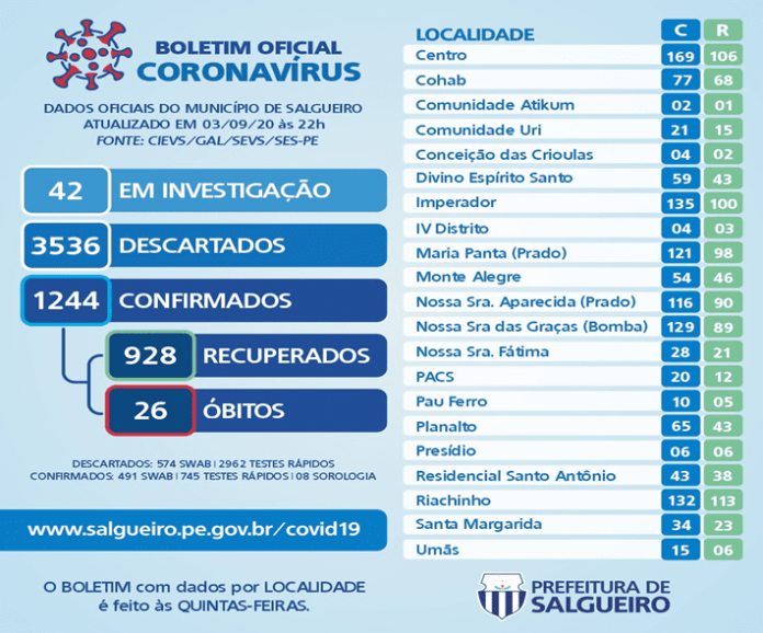 De acordo com a Secretaria Municipal de Saúde (SMS), até o momento, são 1.244 casos confirmados da Covid-19, com 290 casos ativos em Salgueiro. Os casos descartados somam 3.536 e existem 42 em investigação. Os óbitos permanecem em 26.