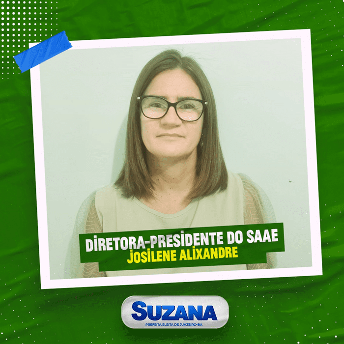 A prefeita eleita de Juazeiro, Suzana Ramos (PSDB), continua divulgando sua futura equipe de governo através das redes sociais e soltou mais um nome. A partir de 1º de janeiro de 2021, o Serviço de Água e Saneamento Ambiental (SAAE) terá como diretora-presidente Josilene Alixandre. Formada em Geografia pela Universidade de Pernambuco (UPE), Josilene também é técnica em Química, com especialidade em controle de qualidade de água e efluente. Ela foi responsável Química no Curtume Campelo e acumula 24 anos de experiência como servidora do SAAE.