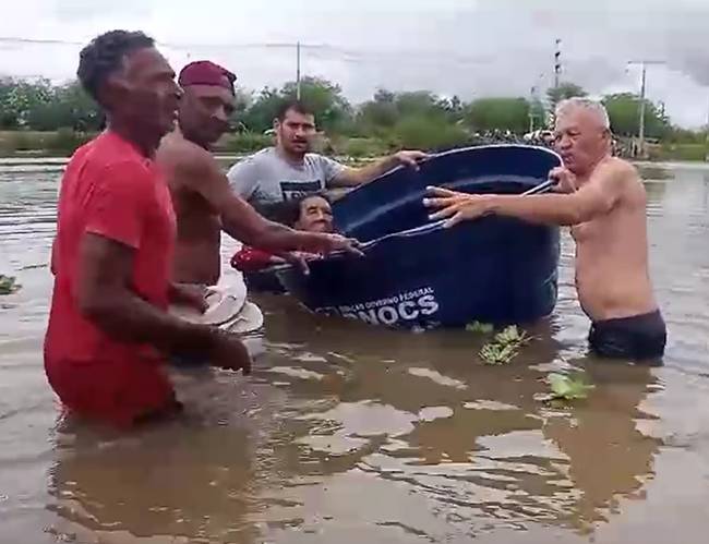 As chuvas intensas que vêm ocorrendo na região levaram a uma situação inusitada em Sobradinho, no Norte da Bahia. Ilhados, alguns idosos que moram na zona rural da cidade receberam a solidariedade de outros moradores para escaparem da área alagada pelo temporal. A solução emergencial foi improvisar uma caixa d’água para retirar os idosos. Um comunitário aproveitou para cobrar das autoridades locais e do poder público a união de forças para minimizar esse cenário no município.