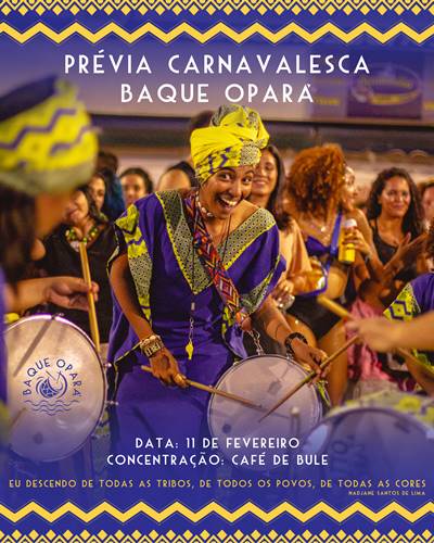 Depois de dois anos em silêncio por conta da pandemia, os tambores do Baque Opará voltarão a contagiar os foliões de Petrolina. O grupo já confirmou sua prévia de Carnaval para o próximo dia 11 de fevereiro. A concentração será em frente ao Café de Bule, na Rua Antônio Santana Filho, 353, Centro da cidade. O cortejo, cujo tema deste ano é “Eu descendo de todas as tribos, de todos os povos, de todas as cores”, seguirá pelas Avenidas Antônio Santana Filho, Souza Filho e Guararapes até a Praça 21 de Setembro, onde a festa continuará e será encerrada. Para mais esclarecimentos, basta entrar em contato pelo e-mail baque2023@gmail.com ou através do telefone (87) 9 9906-7126 (falar com Candyce Duarte).