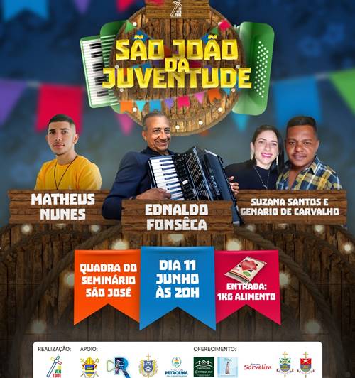 O setor juventude da Diocese de Petrolina está fazendo um convite a todas as famílias católicas a participar do “São João da Juventude”, a ser realizado neste sábado (11), a partir das 20h, na quadra do Seminário São José, Bairro Areia Branca. A programação contará com muita dança, e música da época. A animação ficará a cargo do juiz sanfoneiro Ednaldo Fonseca, Mateus Nunes e Suzana Santos e Genário de Carvalho. A entrada do evento é apenas 1 kg de alimento não perecível, cuja arrecadação será destinada à instituição Casa Boa Nova. O evento deve contar com a presença das famílias dos diversos grupos que compõem as paróquias na cidade de Petrolina.