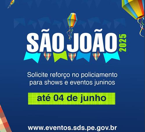 A Secretaria de Defesa Social de Pernambuco (SDS-PE) encerrará no próximo dia 4 de junho o prazo para os organizadores de eventos juninos públicos ou privados solicitarem reforço de efetivo e realização de vistorias. Para fazer a solicitação, os interessados deverão preencher o formulário disponível no site da SDS-PE, idealizado pelo Comitê de Segurança em Grandes Eventos (CSGE) da pasta. Após preenchido, será gerado automaticamente um processo online, comunicando o pedido às Operativas da SDS-PE para a adoção das providências necessárias. A pasta ressalta que os eventos devem estar programados para ocorrer entre 29 de maio e 29 de junho. Além disso, os organizadores devem ficar atentos ao prazo de 15 dias de antecedência em relação à data de realização […]