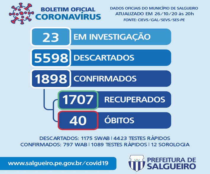 Em Belém do São Francisco (PE), Sertão de Itaparica, a Secretaria de Saúde registrou dois casos do novo coronavírus (Covid-19) e descartou oito, por meio da realização de testes rápidos. Os casos positivos são duas mulheres, de 35 e 51 anos de idade. O boletim informou ainda que a paciente de 35 anos encontra-se recuperada, “tendo em vista que ao realizar o exame diagnóstico foi identificado apenas memória imunológica, ou seja, a paciente já havia sido exposta ao vírus e não apresenta risco de transmissão”. Além disso, mais quatro casos foram classificados como clinicamente recuperados. Assim, Belém contabiliza 156 casos positivos, 151 recuperações e nenhum óbito pela Covid-19.