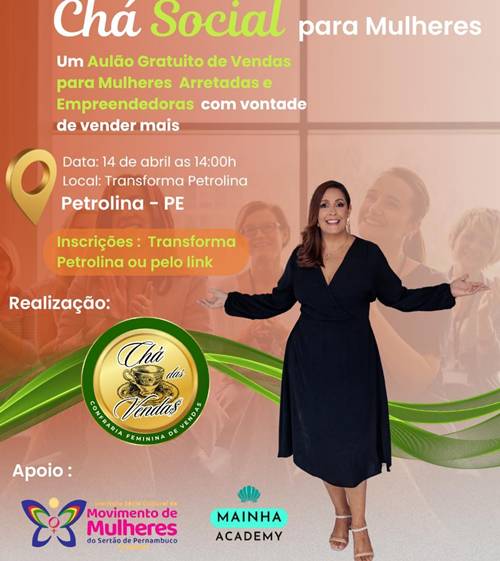 Nesta segunda-feira (14), a partir das 14h, Petrolina e região têm um encontro marcado com o Chá Social para Mulheres. Um aulão gratuito de vendas voltado especialmente para mulheres arretadas, empreendedoras e cheias de vontade de vender mais. O evento é promovido pelo projeto Chá das Vendas e promete uma tarde de muito aprendizado, trocas de experiências e conexões com outras mulheres que também estão na luta para fazer seus negócios crescerem. A proposta é incentivar e fortalecer o empreendedorismo feminino, oferecendo dicas práticas e estratégias para impulsionar as vendas. As inscrições são gratuitas e podem ser feitas por meio do link https://l.chadasvendas.com/inscricao-aulao-de-vendas-petrolina-pe.