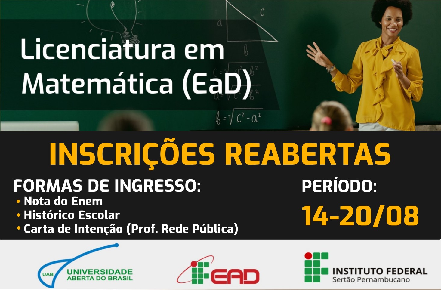 Estão abertas, de hoje (14) até o próximo dia 20 de agosto, as inscrições do processo seletivo para o curso de graduação em Licenciatura em Matemática na modalidade EaD do Instituto Federal do Sertão Pernambucano (IFSertãoPE). A iniciativa é realizada em parceria com a Universidade Aberta do Brasil (UAB) e contará com polos de apoio presencial em quatro cidades da região. As atividades letivas estão previstas para ter início no mês de setembro deste ano. De acordo com o edital n.º 70/2023, o curso de Licenciatura em Matemática será ministrado nos polos de Dormentes, Sertânia, Cabrobó e Afrânio. No total, estão disponíveis 26 vagas destinadas a egressos de escolas públicas, concorrência geral e professores da rede pública. O curso adota […]