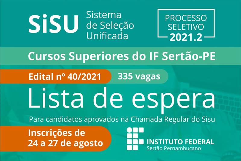 O Instituto Federal do Sertão Pernambucano (IFSertãoPE) publicou na última sexta-feira (20) o Edital nº 40/2021, destinado à convocação dos candidatos selecionados para a lista de espera do Sistema de Seleção Unificada (Sisu), com ingresso no segundo semestre de 2021. A ocupação das vagas remanescentes nos cursos de graduação tecnológica, bacharelado e licenciatura oferecidos pela instituição utilizará como referência a lista de espera do Sisu 2021.2, obedecendo, ainda, às cotas instituídas por lei. De acordo com a assessoria do IFSertãoPE, são 335 vagas remanescentes em 13 cursos oferecidos pelos campi Floresta, Ouricuri, Petrolina, Petrolina Zona Rural, Salgueiro e Serra Talhada. Todos os candidatos selecionados para a lista de espera do Sisu 2021.2 deverão se inscrever a partir desta terça (24) […]