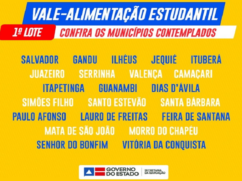 A entrega do vale-alimentação para estudantes da rede estadual de ensino de 22 municípios da Bahia começa nesta segunda-feira (20). O Governo do Estado, por meio da Secretaria da Educação, beneficiará cerca de 284 mil estudantes. Para evitar aglomerações nos supermercados, em função das orientações de combate ao coronavírus, parte dos estudantes receberá o benefício na Cesta do Povo, e em suas lojas credenciadas, e parte, na rede Assaí. A lista com esta distribuição entre as escolas está disponível no Portal da Educação. Na lista também tem uma indicação para que o estudante vá, preferencialmente, à rede localizada mais próxima da sua escola. É necessário que o estudante, o pai, a mãe ou responsável esteja com o cadastro atualizado do […]