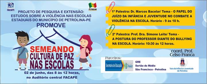 A Faculdade de Ciências Aplicadas e sociais de Petrolina (Facape) sediará na próxima quinta-feira (2/06) um evento que tem como objetivo discutir a cultura de paz nas escolas. Segundo organizadores, o evento é fruto do projeto de Pesquisa e Extensão intitulado ‘Estudos sobre a Violência nas Escolas Estaduais de Petrolina’, que teve início em 2015. Fazem parte desse projeto 36 alunos dos vários cursos da Facape, que, durante um ano e meio participaram de palestras, fizeram pesquisa bibliográfica e pesquisa de campo em 6 escolas da rede estadual da cidade. Durante o evento, haverá palestras com o juiz da Vara da Infância e Juventude, Marcos Bacelar, e com a professora Simone Leite, que falará sobre a postura do professor diante do bullying. O […]