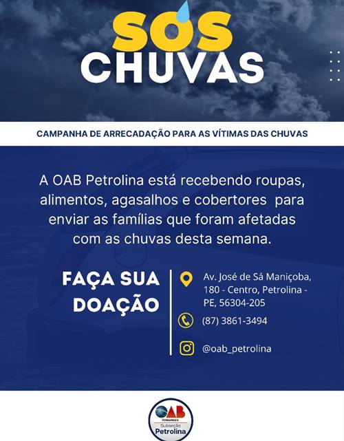 Uma corrente de solidariedade se formou para ajudar os milhares de desabrigados atingidos pelas fortes chuvas no Grande Recife e Região Metropolitana. A Subseção Petrolina da Ordem dos Advogados do Brasil OAB/PE reforçou a causa e transformou sua sede em ponto de arrecadação de doações de alimentos não perecíveis, produtos de higiene pessoal e agasalhos. As doações podem ser feitas de segunda a sexta, das 9h às 17h, na OAB local, que fica na Avenida José de Sá Maniçoba, nº 180, Centro (ao lado do Igeprev). A ação conjunta tem o envolvimento da OAB/Seccional Pernambuco, Caixa de Assistência dos Advogados de Pernambuco (CAAPE) Escola Superior de Advocacia (ESA), Instituto dos Advogados de Pernambuco (IAP) e Associação dos Advogados Trabalhistas de […]